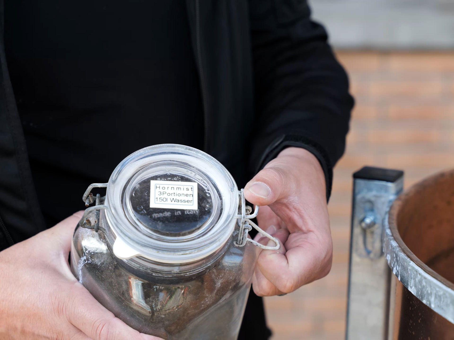 Wir dynamisieren Hornmist und Hornkiesel in Wasser und rühren dies unter strikter Anweisung von Erwärmung und abwechselnd in die Gegenrichtung eine Stunde lang. Das so entstandene biodynamische Präparat verteilen wir an ausgewählten Tagen auf dem Boden und in den Bäumen, damit die Entwicklung der Pflanzen begünstigt wird.